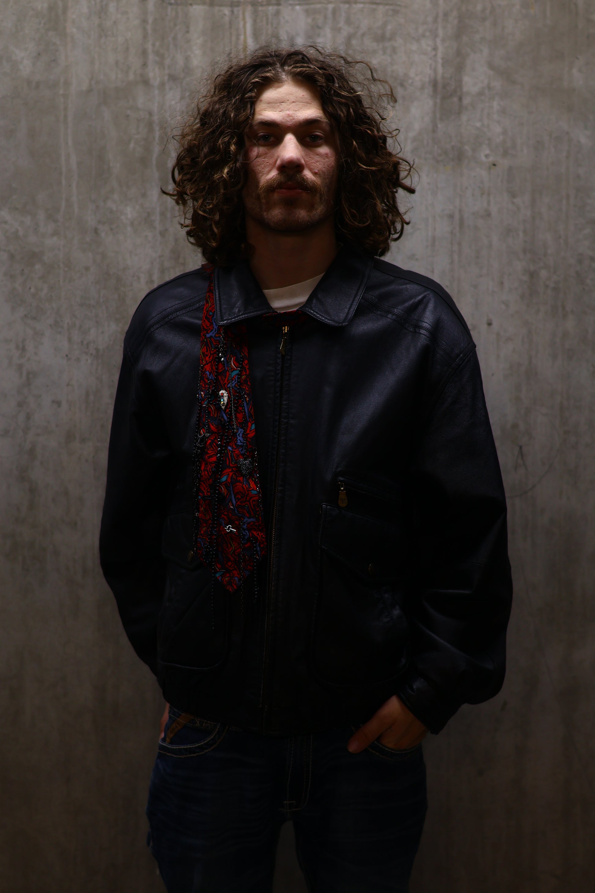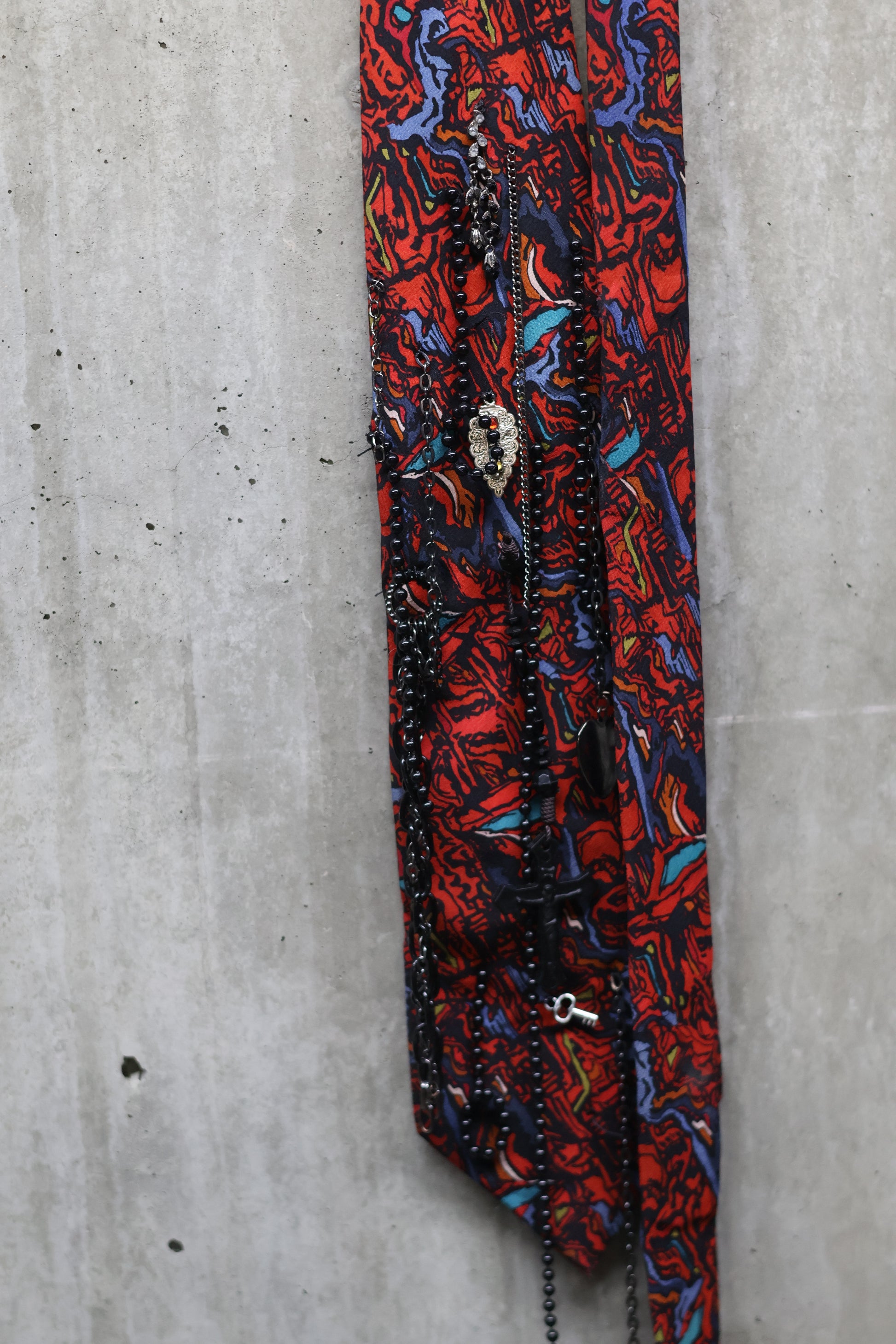 Vintage tie with hand sewn jewelry. Jewelry on half of the tie.