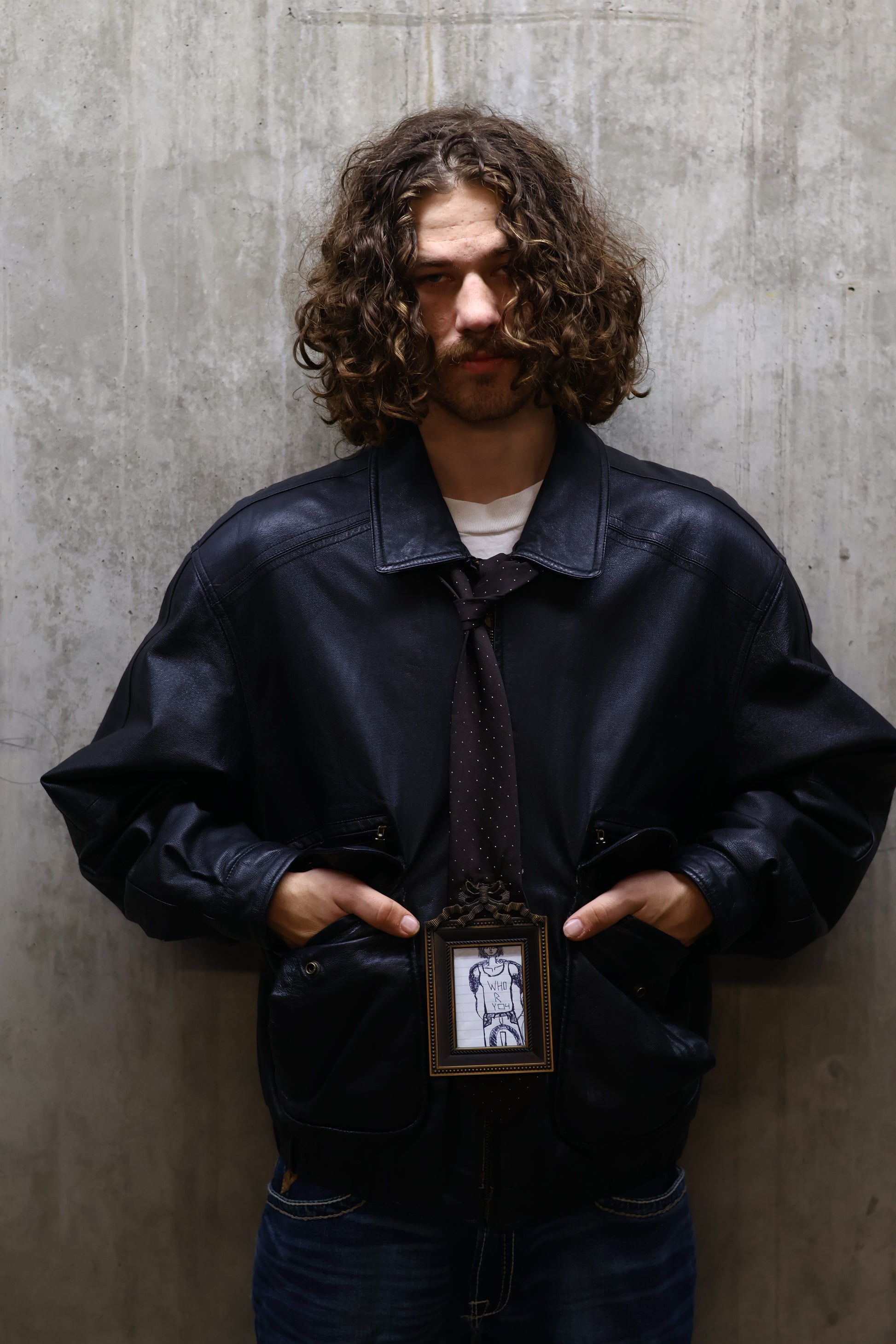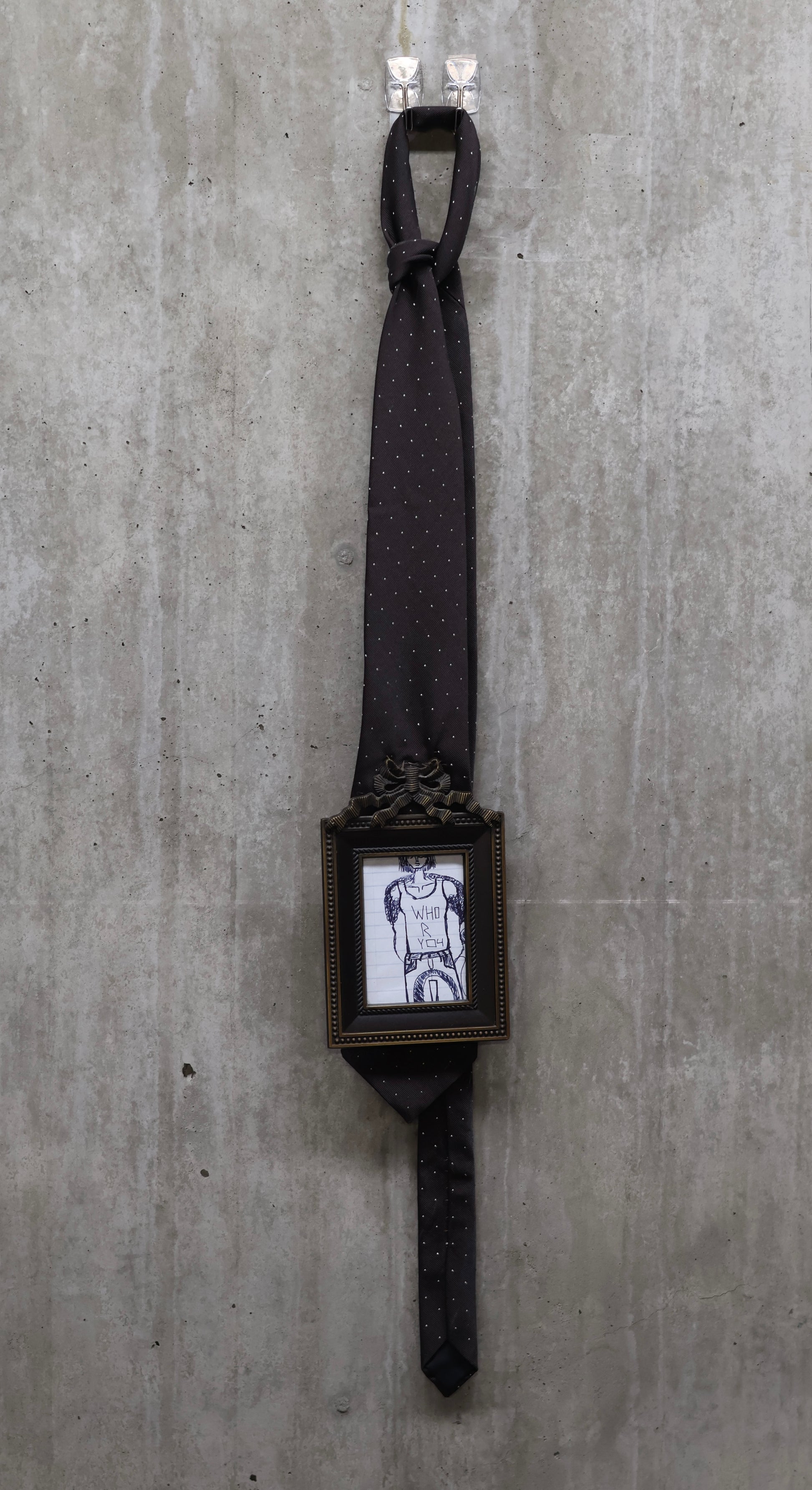 A brown tie with white poke a dots. Vintage bow frame hand sew on with addition of glue. Can change the image inside of the frame as traditionally.